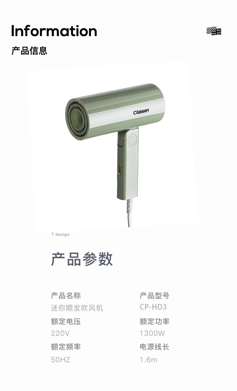 产品参数: 产品型号:CP-HD3 额定电压:220V~ 额定频率:50Hz 额定功率:1300W 产品尺寸:150X183X65mm 包装尺寸:195X126X84mm 产品毛重 : ,535g 包装清单:主机x1、电源线x1、收纳袋x1、说明书x1 核心卖点: 1、仅重400克,便携折叠设计,减轻出游压力,适合旅行达人 2、1300W功率,动力疾速,转速达21000转及7.85Nm大扭矩 3、出风口风速达13m/s,创新发热体设计,均匀受热 4、内含千万负离子,给头发负离子烫般的顺滑 5、两档风力可调节,强风定型,细风养发,轻松应对多种发型 6、一档自然风,温度40度左右,二档热风,100度左右