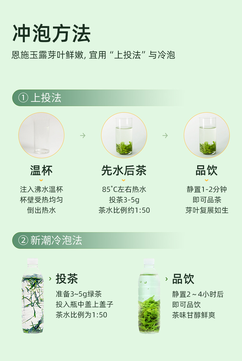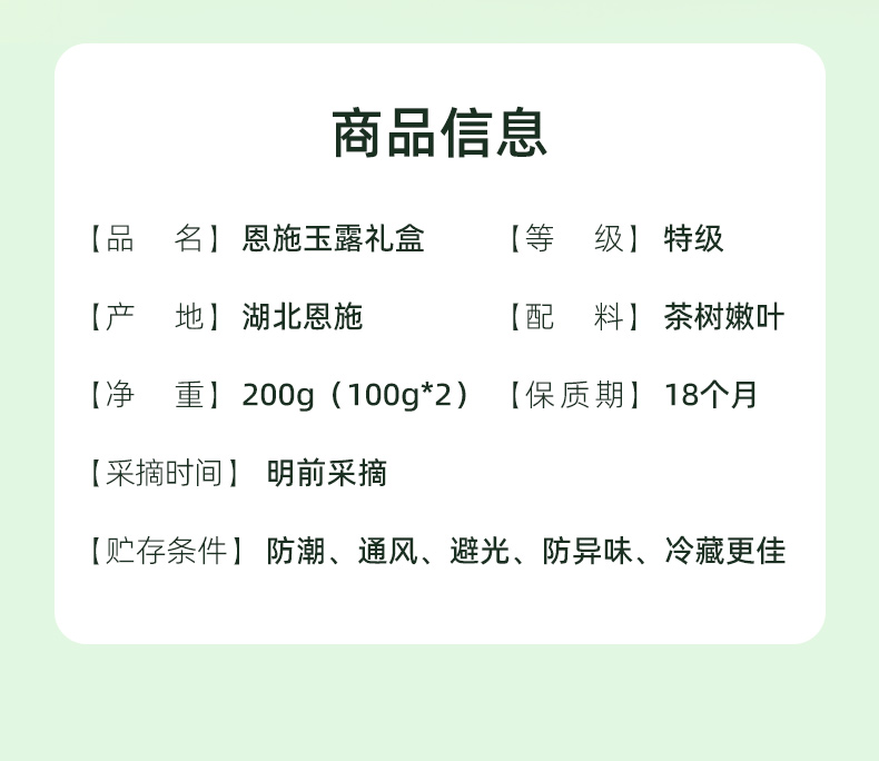 【等级】特级 【产地】湖北恩施 【净重】200g(50g*4) 【保质期】18个月 【配 料】茶树嫩叶 【采摘时间】 明前采摘 【贮存条件】 防潮、通风、避光、防异味、冷藏更佳