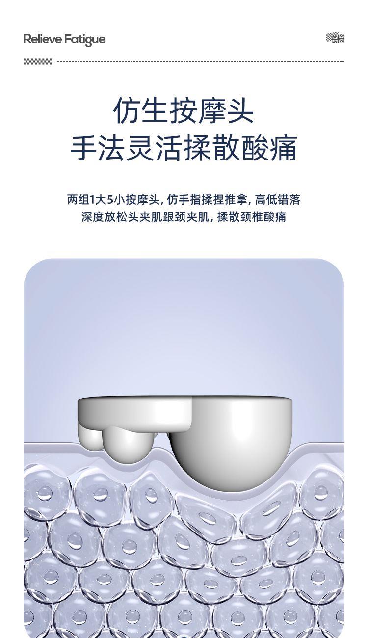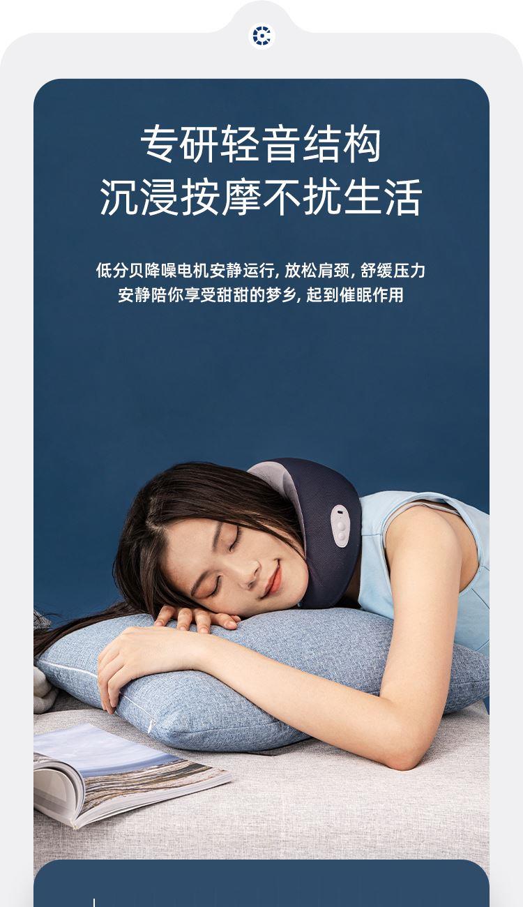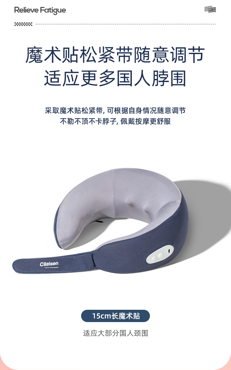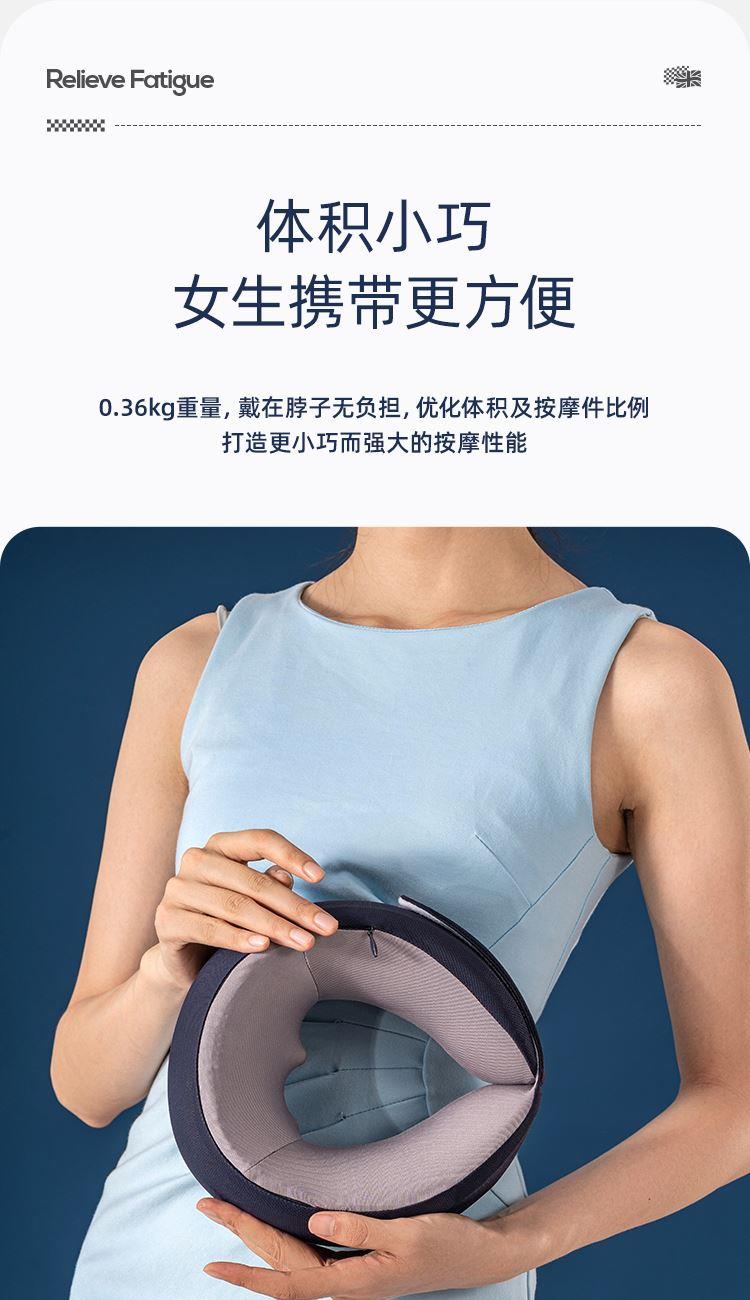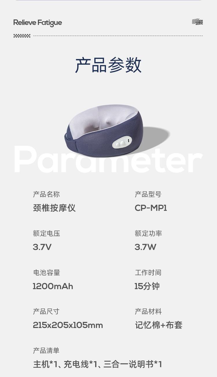 产品参数: 产品型号:CP-MP1 额定电压:3.7V⎓ 额定功率:3.7W 电池容量:1200mAh 产品尺寸 : 215X205X105mm 包装尺寸:220X115X210mm 商品条码 : 6972831860556 产品毛重 : 526kg 包装清单:主机X1、充电线X1、说明书X1 核心卖点: 1、仿生按摩头,手法灵活揉散酸痛 2、慢回弹海绵支撑,360°立体环绕支撑 3、魔术贴松紧带随意调节,适应更多国人围脖 4、42℃温和热敷,温暖舒缓肩颈;热敷功能可单独开启 5、体积小巧,女生携带更方便 6、低分贝降噪电机安静运行,沉浸按摩不扰好眠