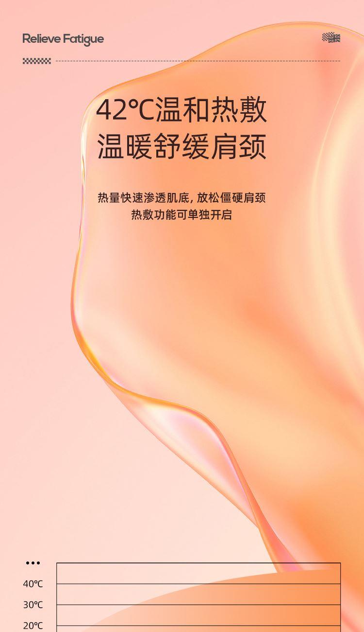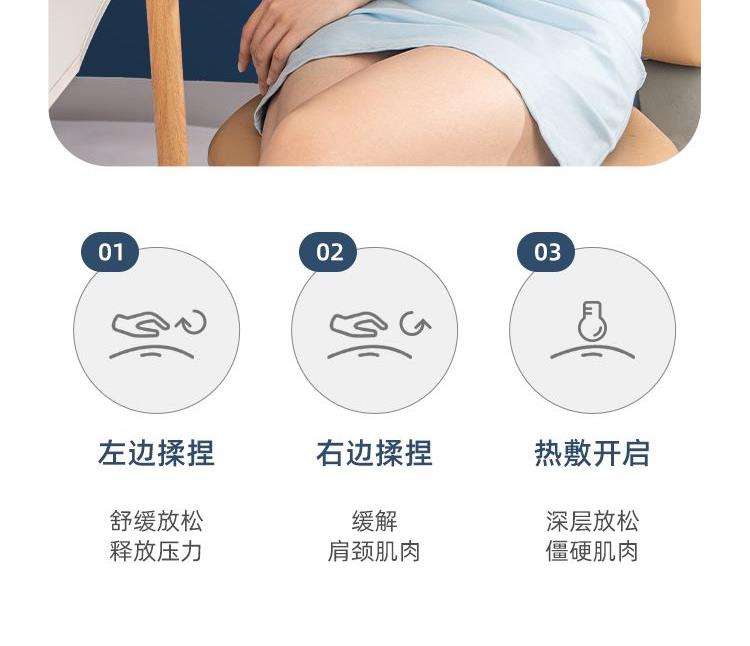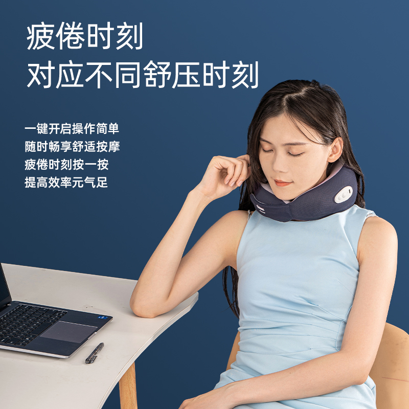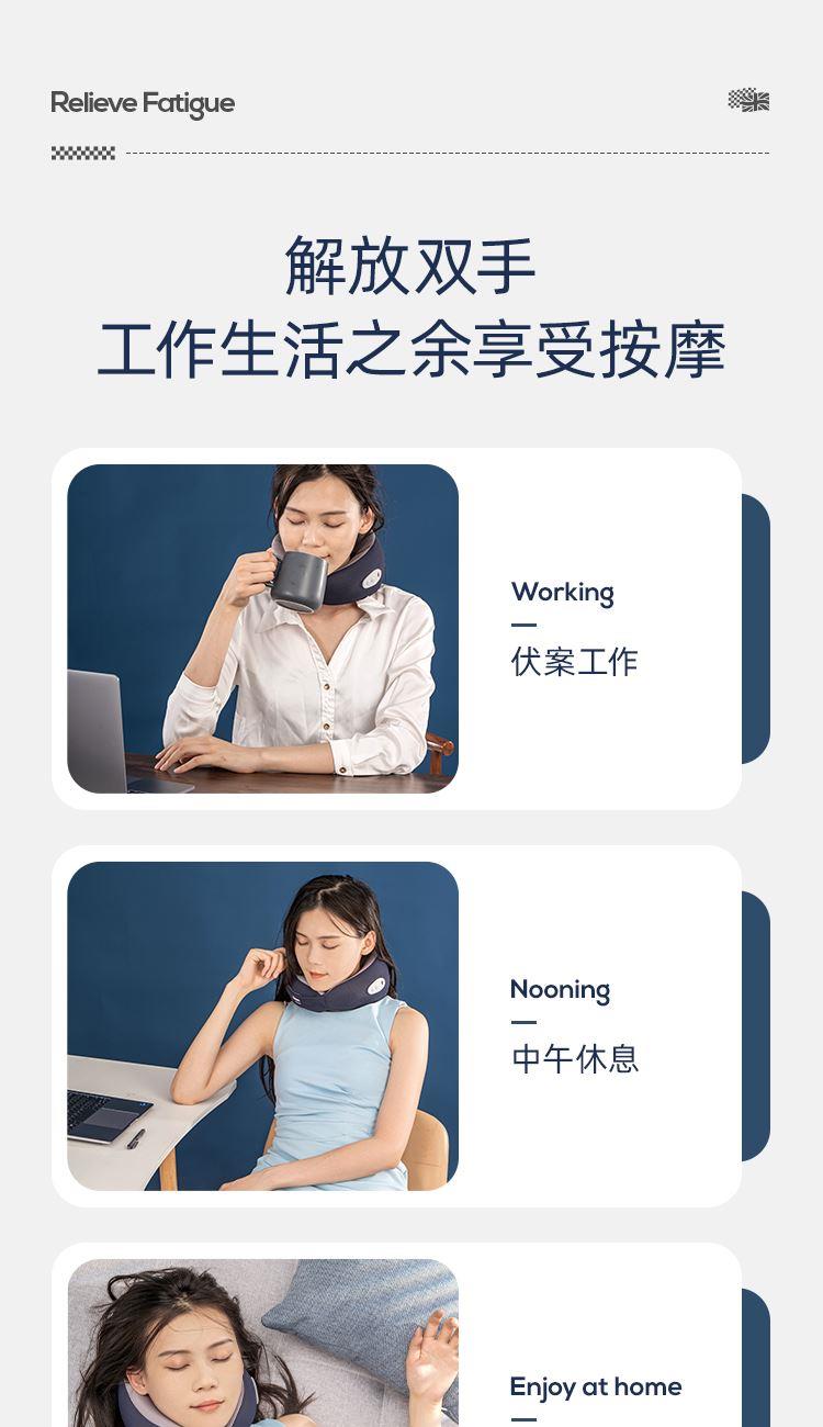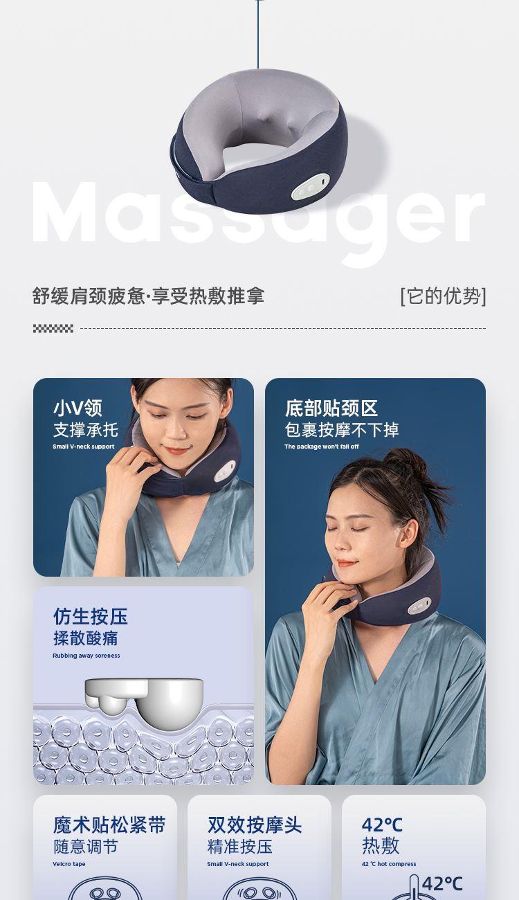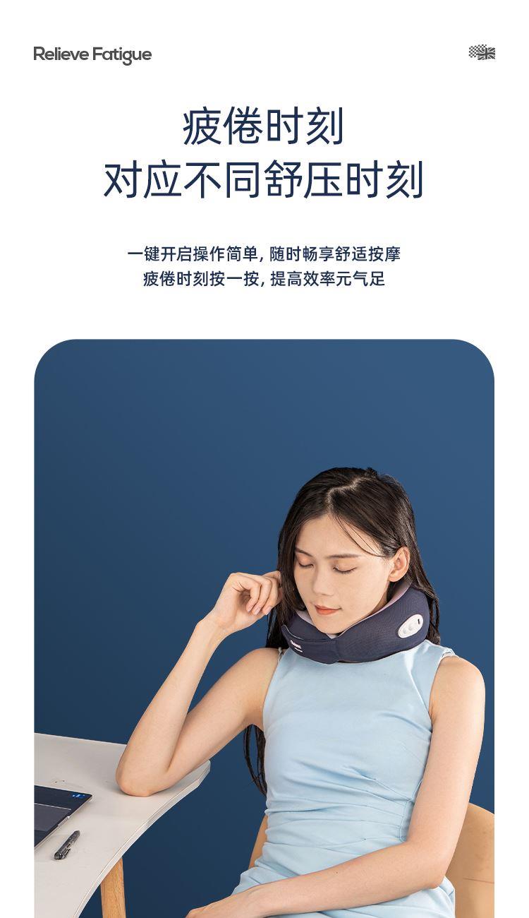 产品参数: 产品型号:CP-MP1 额定电压:3.7V⎓ 额定功率:3.7W 电池容量:1200mAh 产品尺寸 : 215X205X105mm 包装尺寸:220X115X210mm 商品条码 : 6972831860556 产品毛重 : 526kg 包装清单:主机X1、充电线X1、说明书X1 核心卖点: 1、仿生按摩头,手法灵活揉散酸痛 2、慢回弹海绵支撑,360°立体环绕支撑 3、魔术贴松紧带随意调节,适应更多国人围脖 4、42℃温和热敷,温暖舒缓肩颈;热敷功能可单独开启 5、体积小巧,女生携带更方便 6、低分贝降噪电机安静运行,沉浸按摩不扰好眠