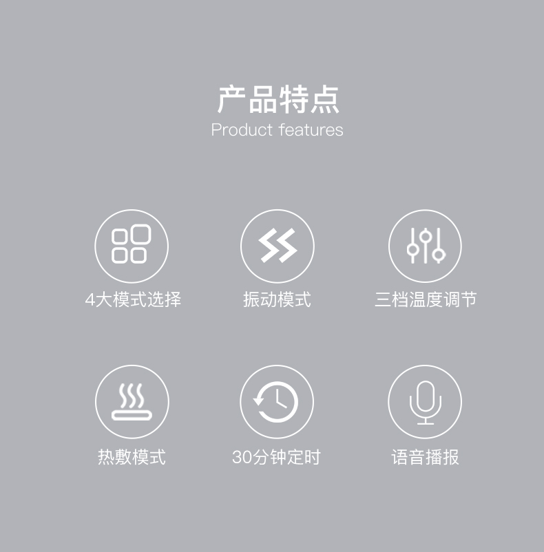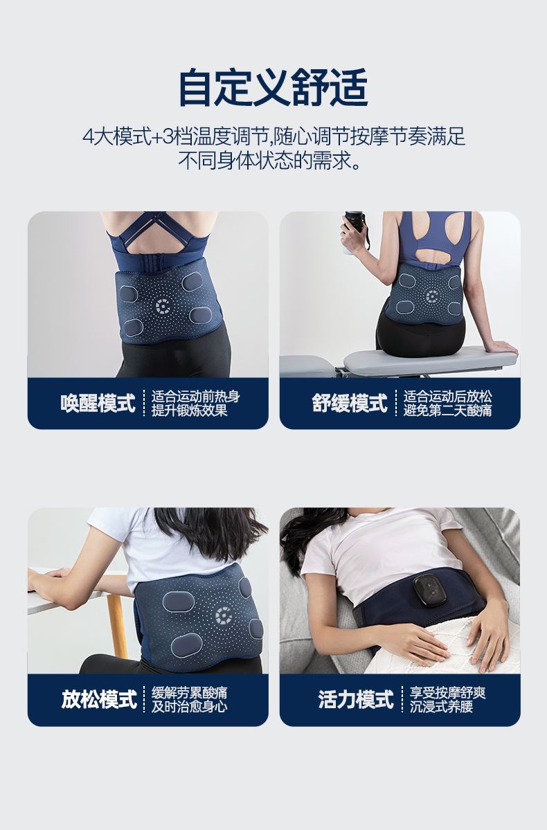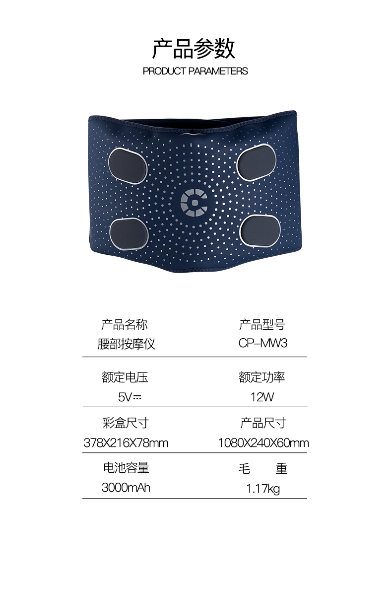 产品型号:CP-MW3 额定电压 : 5V⎓ 额定功率:12W 电池容量:3000mAh 产品毛重 : 1.17kg 产品尺寸:1080X240X60mm(展开) 包装尺寸: 378*216*78mm 外箱尺寸:570X428X487mm 包装清单:主机X1、充电线X1、说明书X1 核心卖点: 1. 4大舒爽模式,为腰部注入活力 2、高频振动波,覆盖4大核心肌群 3、三档温感热敷,热感渗透入内 立享舒畅 4、大面积热敷,让紧绷肌肉活动起来 5、智能定时,享受30分钟惬意放松