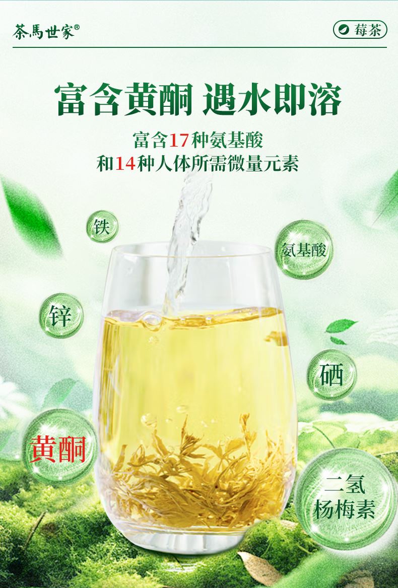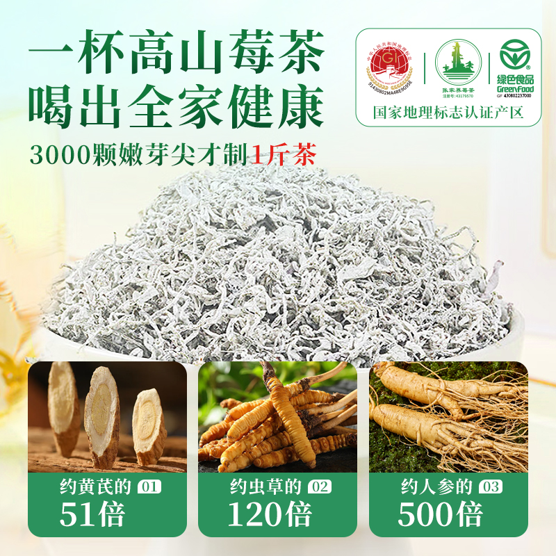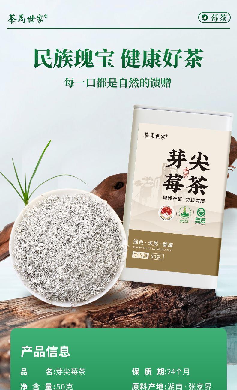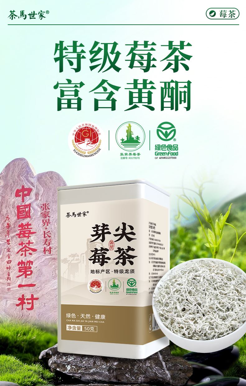 1.源自湖南张家界高山生态茶园,常年云雾缭绕,湿度适宜,地理标志保护产品 绿色食品认证 2.人工手采高山莓茶,特级3-5cm芽尖,优中选优,干茶白霜满披,手捻成粉 3.富含黄铜及多种氨基酸等微量元素,常喝护嗓子,用嗓多人群必备 4.入口清甜无涩,回甘快,喉间清爽舒适。无咖啡因,睡前也能喝,百搭可调味 5.铁罐装,双罐送手提袋,适合自饮,送礼