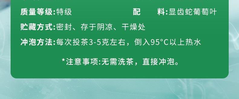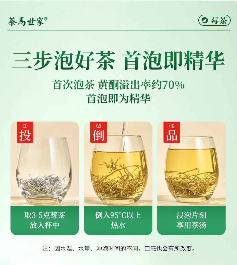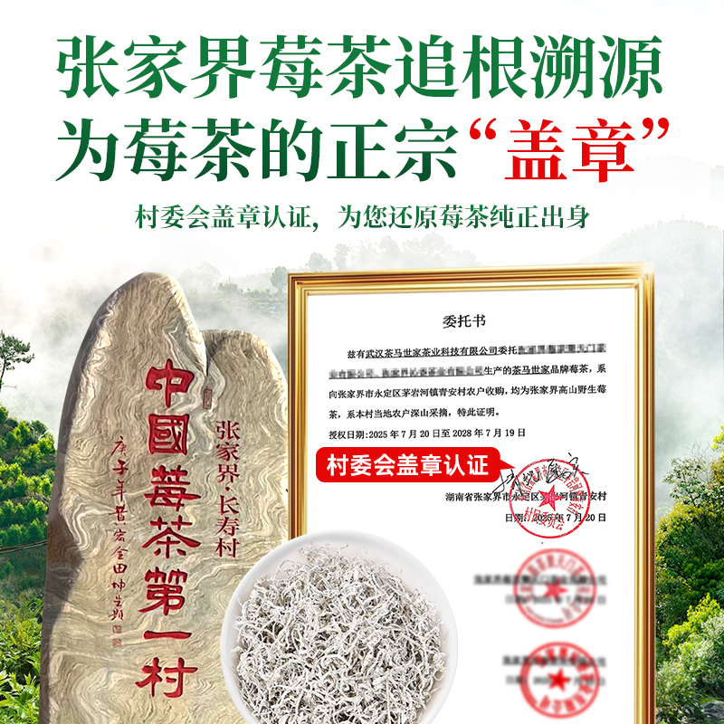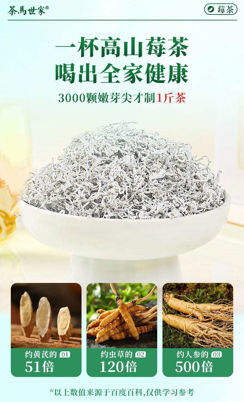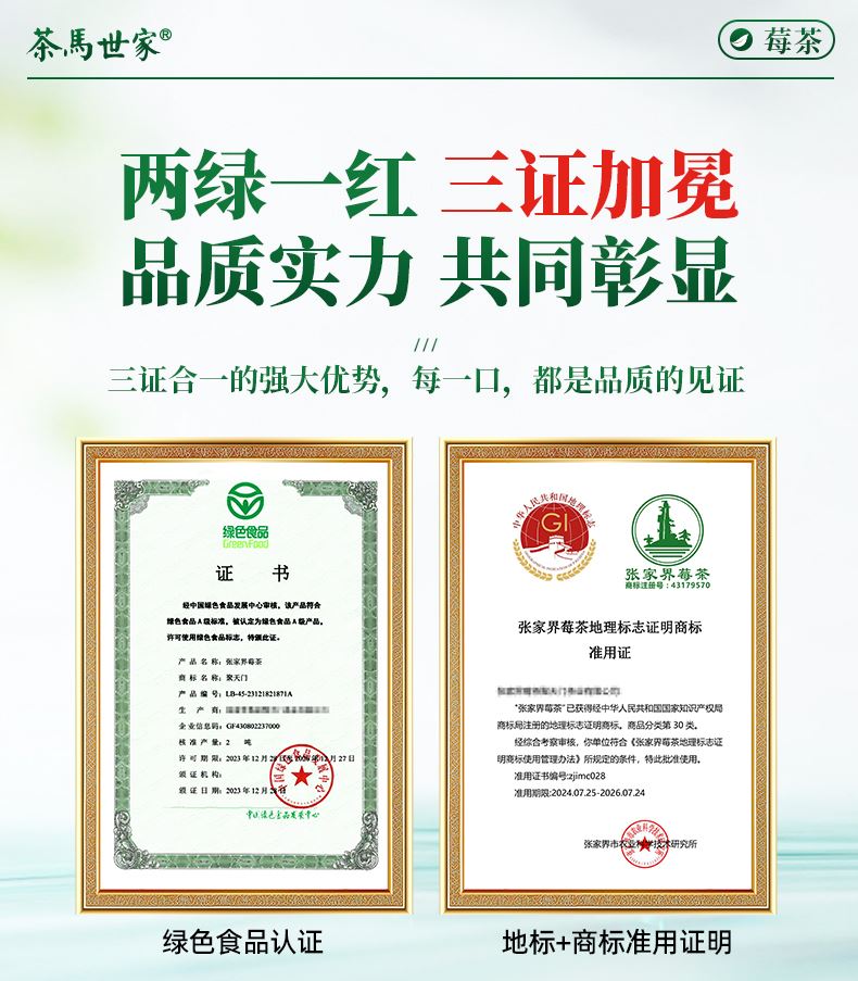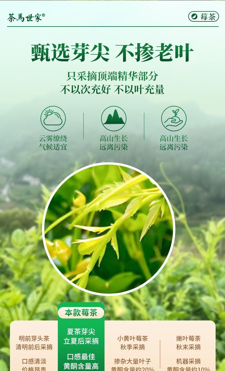 1.源自湖南张家界高山生态茶园,常年云雾缭绕,湿度适宜,地理标志保护产品 绿色食品认证 2.人工手采高山莓茶,特级3-5cm芽尖,优中选优,干茶白霜满披,手捻成粉 3.富含黄铜及多种氨基酸等微量元素,常喝护嗓子,用嗓多人群必备 4.入口清甜无涩,回甘快,喉间清爽舒适。无咖啡因,睡前也能喝,百搭可调味 5.铁罐装,双罐送手提袋,适合自饮,送礼