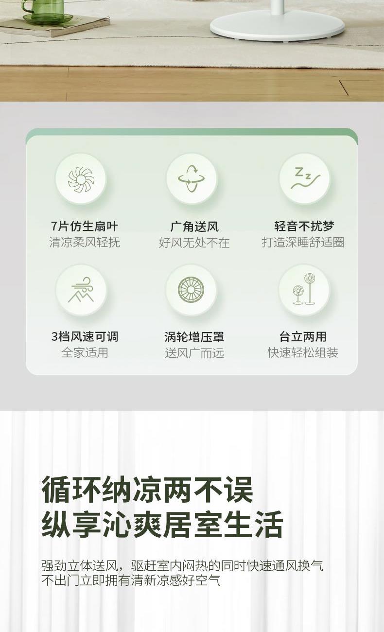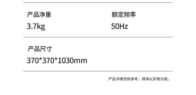 产品尺寸:370*370*1030mm 外箱尺寸:385*225*375mm 单台净重:3.7kg 单台毛重:4.4kg 包装材料:邮购包 > 3档风速调节,顶部旋钮不弯腰,操作简单 > 7叶仿生羽翼,提升风量 > 1100mm加高机身,长距离送风 > 底座带有配重块,更加稳固不易倾倒 > 分段机身设计,一步旋拆,台立两用,简单方便